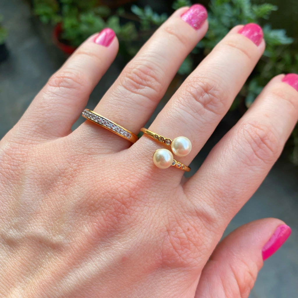 Anel ajustável semijoia com pérolas e aro cravejado com zircônias banhado a ouro 18k