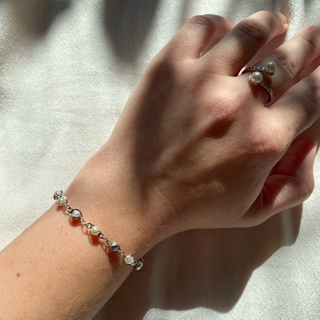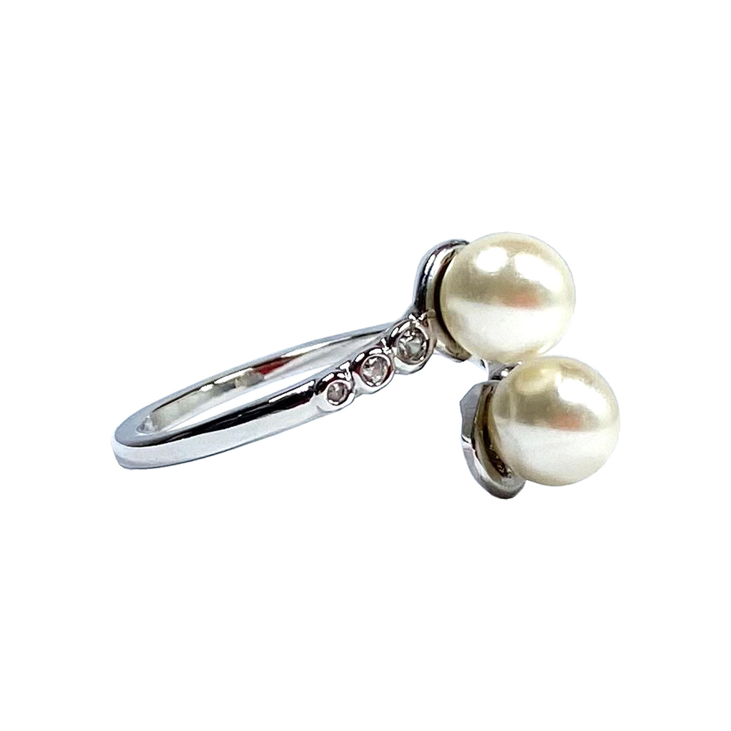 Anel ajustável semijoia com pérolas e aro cravejado com zircônias banhado a ródio branco