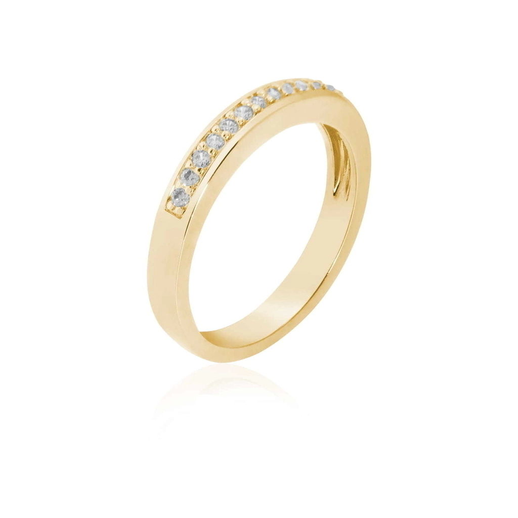 Anel semijoia meia-aliança cravejado com zircônias brancas, banhado a ouro 18k