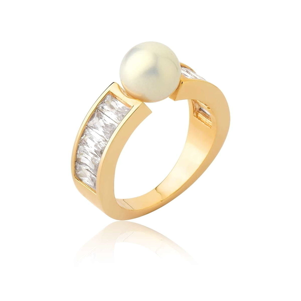 Anel semijoia com pérola central e aro carvejado em baguetes de zircônias, banhado a ouro 18k