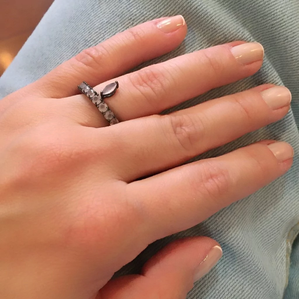 Anel aparador em semijoia cravejado em toda a volta do aro com cristais leitosos em corte redondo na cor rosê e pingente fixo em corte navete de mesma pedra banhado a ródio negro.
