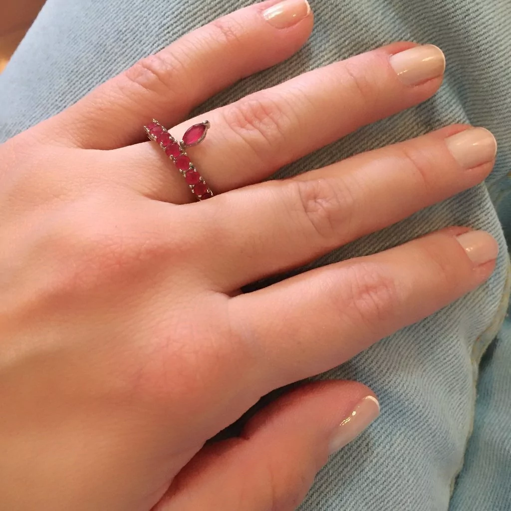 Perfeito para combinar com outros anéis fazendo composê, anel aparador em semijoia cravejado em toda a volta do aro com cristais leitosos em corte redondo na cor rubelita e pingente fixo em corte navete de mesma pedra banhado a ródio branco.