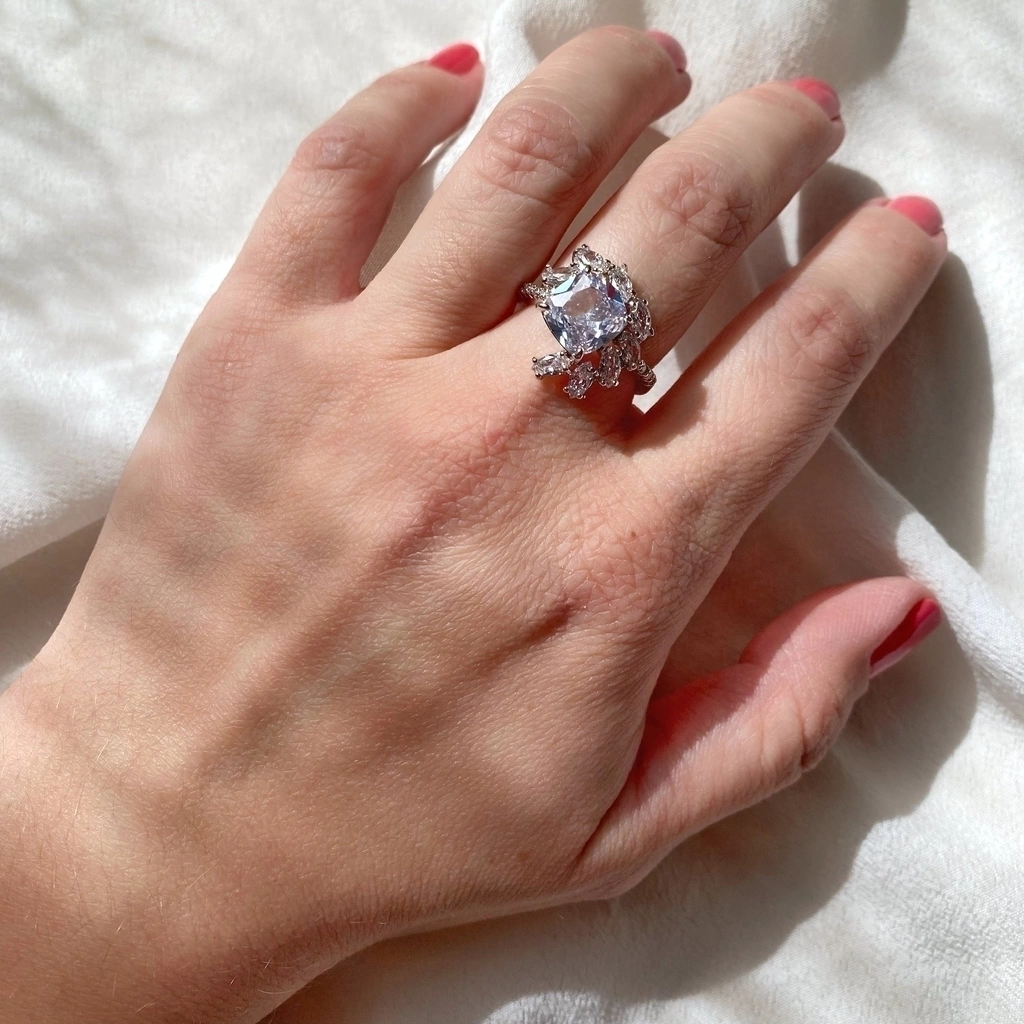 Anel semijoia de pedra central carré de cristais brancos e pedras navetes e redondas em zircônias brancas banhado a ródio branco