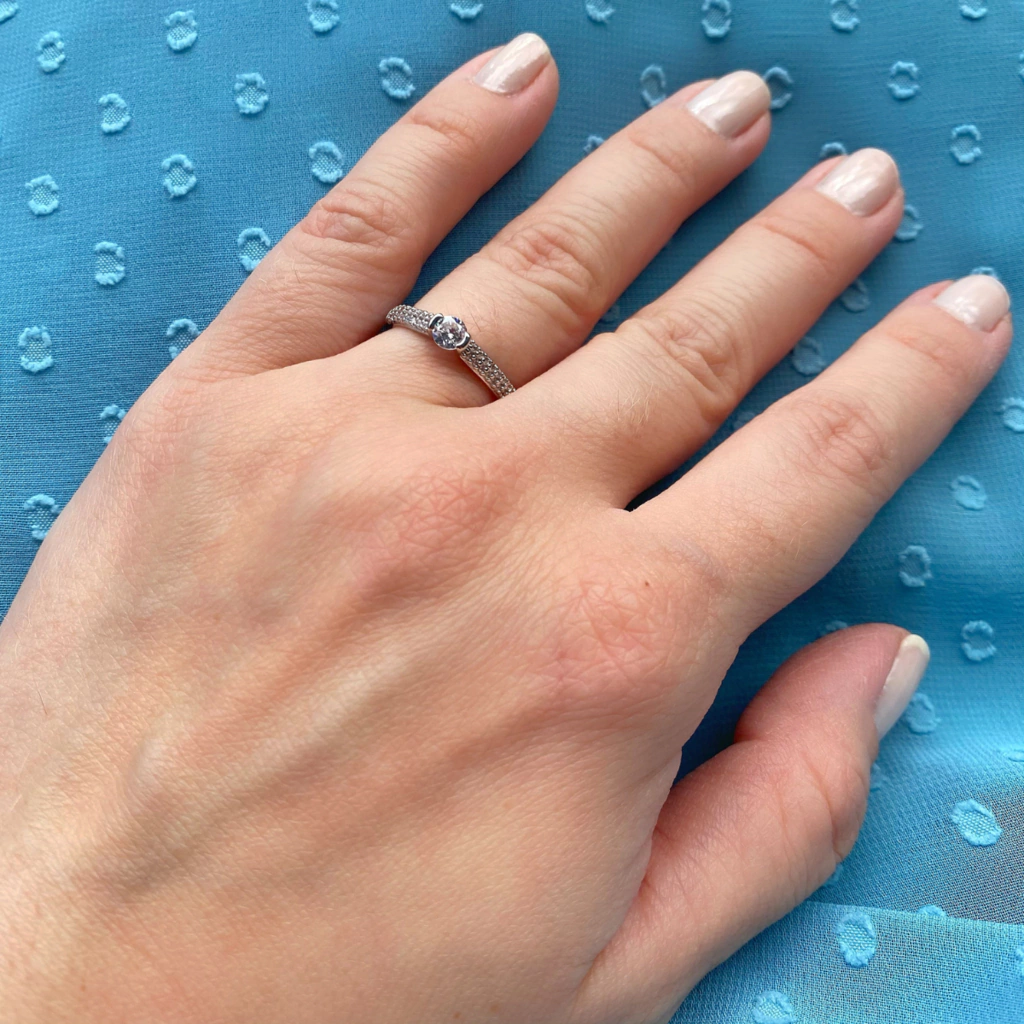 Anel solitário semijoia com pedra redonda de zircônia branca 6 mm e aro filete cravejado na metade de zircônias brancas banhado a ródio branco