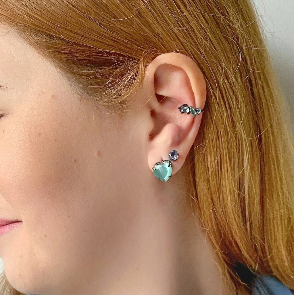 Brinco semijoia em formato de coração com pedra cristal calcedônia turmalina, com tarraxa borboleta banhado a ródio negro