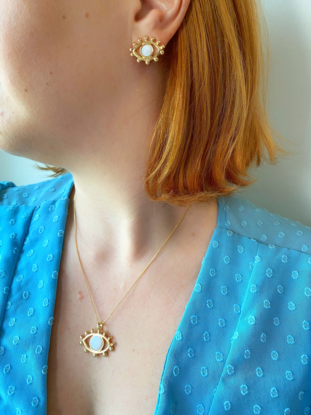 Colar semijoia com pingente em formato de olho grego cravejado com pedra natural madrepérola, corrente veneziana fina com fecho boia, banhado a ouro 18k