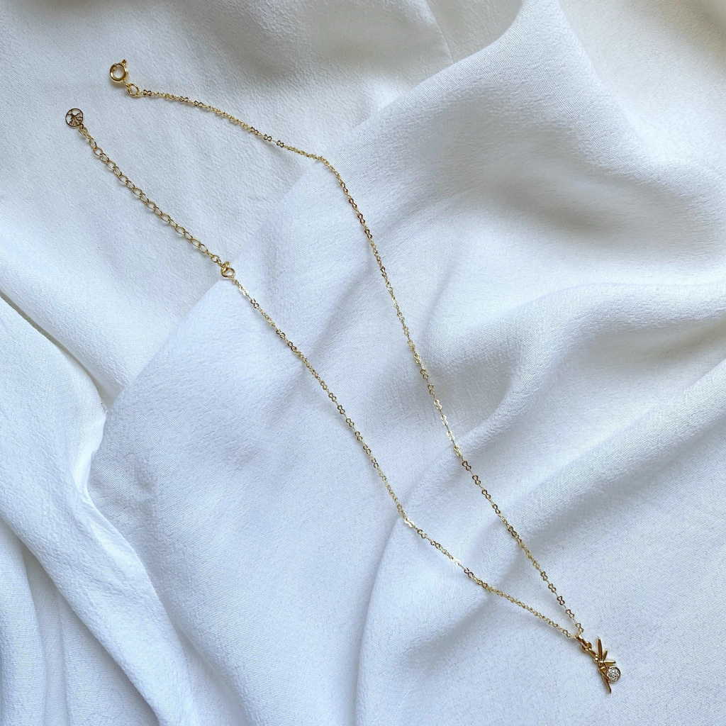 Colar semijoia com pingente pequeno de fada cravejado com micro zircônias brancas, corrente oitinho com fecho boia e extensor com ponteira de árvore da vida, banhados a ouro 18k