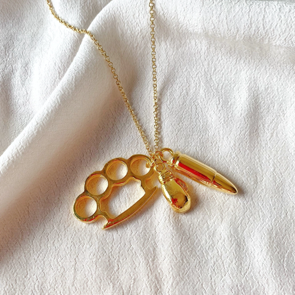 Colar semijoia com pingentes de soco inglês, luva boxe e bala, corrente veneziana, fecho lagosta, banhado a ouro 18k