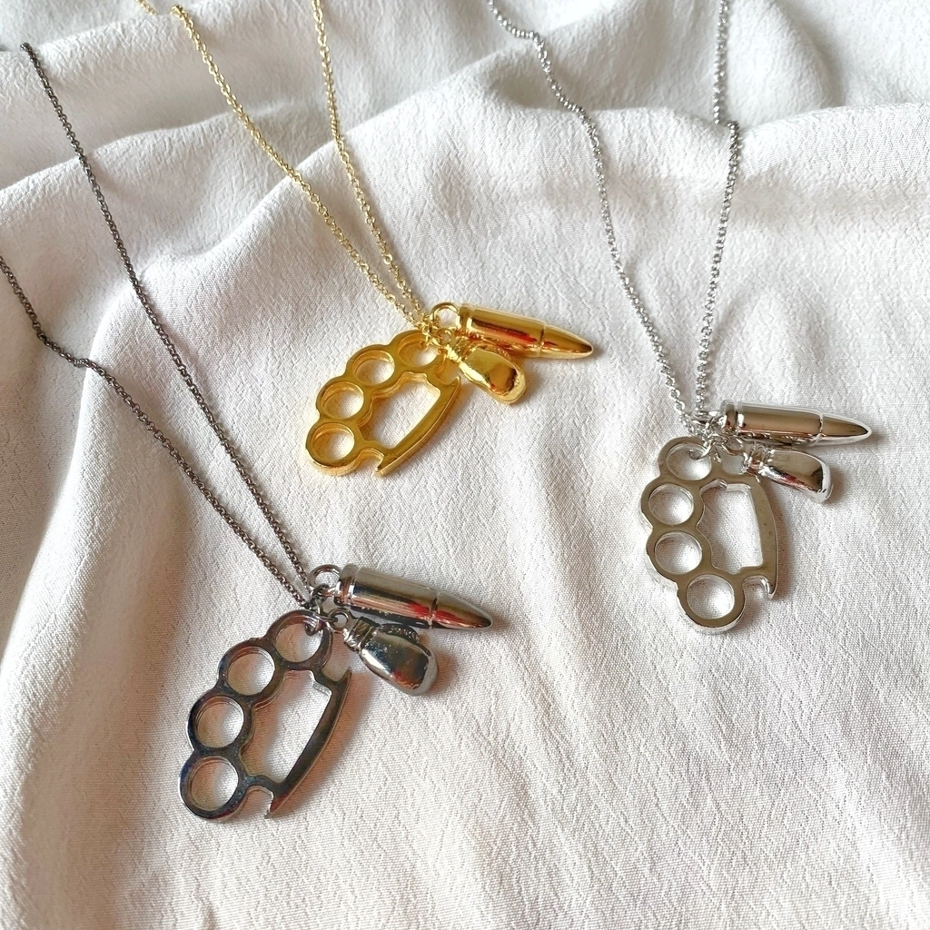 Colar semijoia com pingentes de soco inglês, luva boxe e bala, corrente veneziana, fecho lagosta, banhado a ródio negro