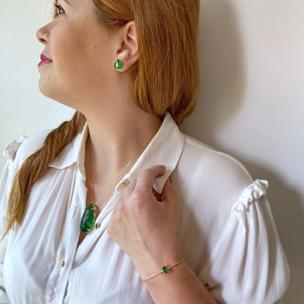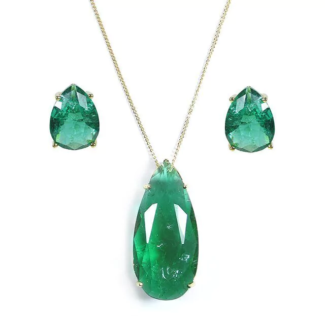 Conjunto gota grande esmeralda fusion banho ouro