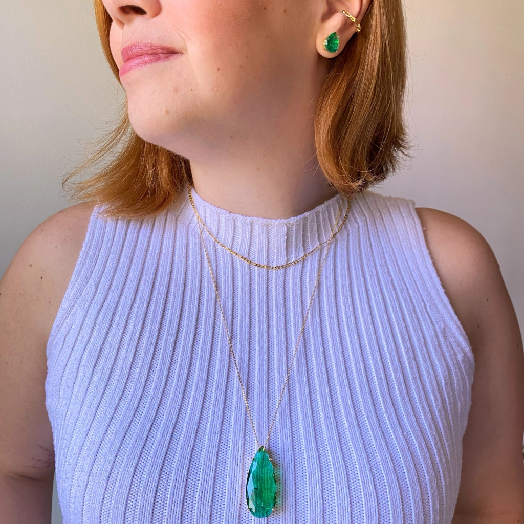 Conjunto semijoia de brinco em formato gota pequeno de cristal esmeralda fusion, com tarraxa borboleta; e colar pingente gota grande em cristal esmeralda fusion e corrente cadeado, fecho boia, banhados a ouro 18k