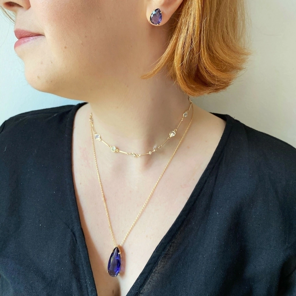 Conjunto semijoia de brinco em formato gota pequeno de cristal tanzanita fusion, com tarraxa borboleta; colar pingente gota médio em cristal tanzanita fusion e corrente cadeado fina, fecho boia, banhados a ouro 18k