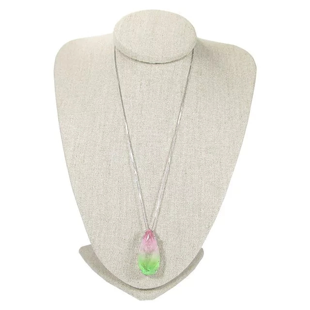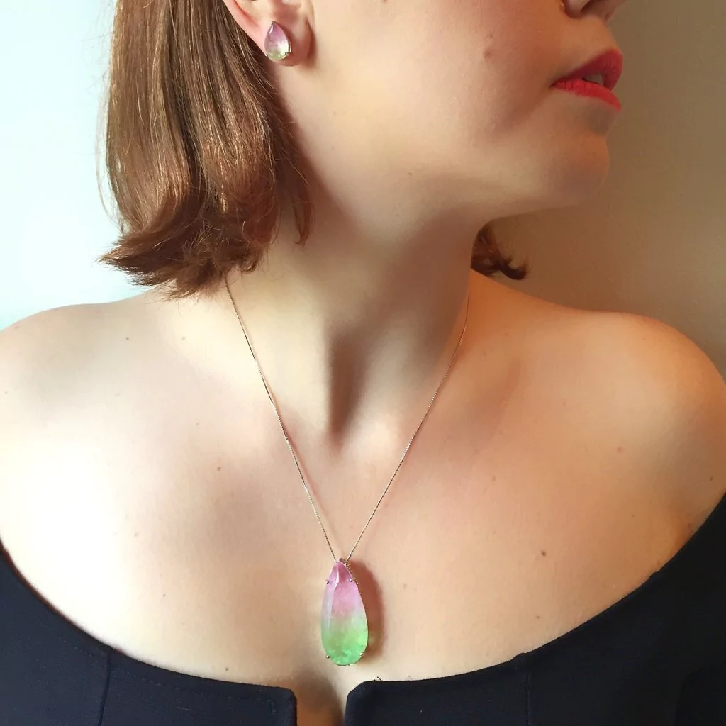 Conjunto semijoia de pingente e brinco em formato gota com pedras em cristal rainbow cor melancia banhados a ródio branco