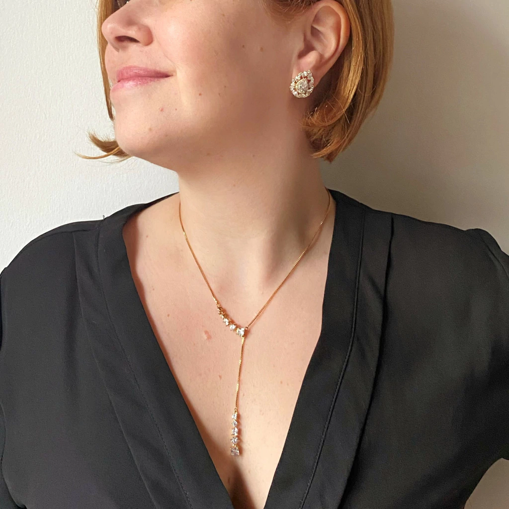 Colar semijoia de gravata cravejado em zircônias brancas, em corrente veneziana com fecho lagosta, e extensor com ponteira de gota, banhado a ouro 18k