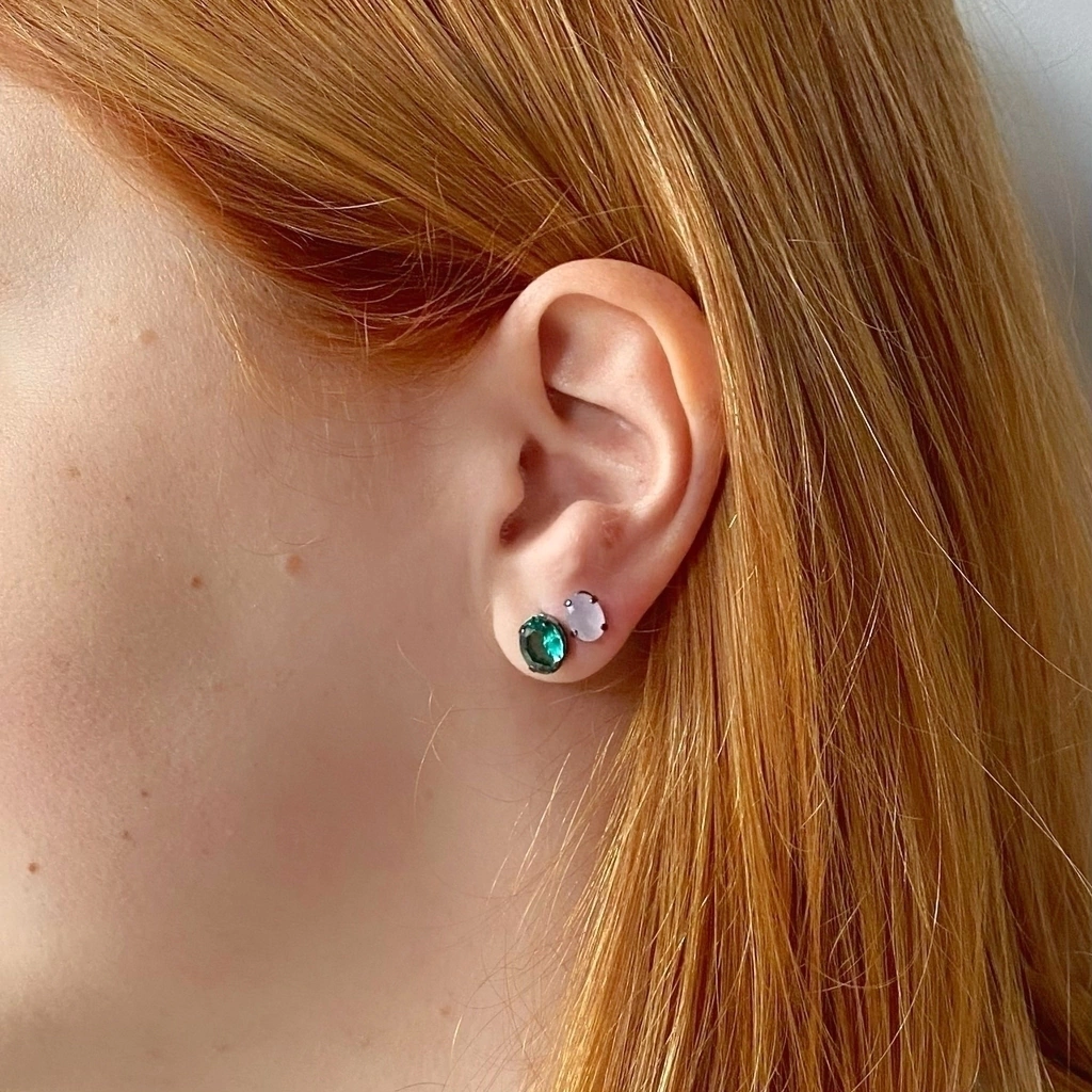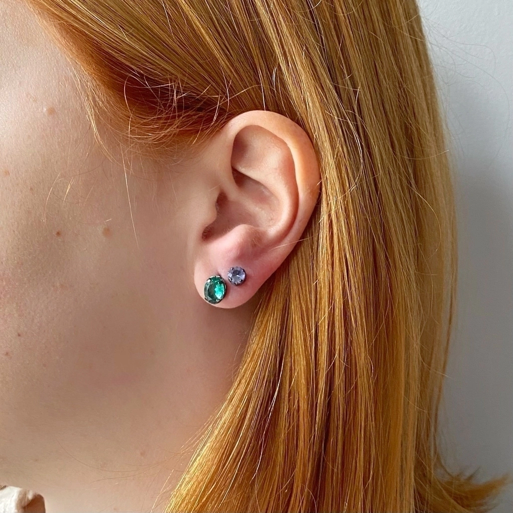 Kit composto por três brincos semi joias em formato ovais cravejado em pedras cristais cores esmeralda e rosa leitoso, e formato redondo com pedra cristal cor ametista, tarraxa borboleta, banhado a ródio negro