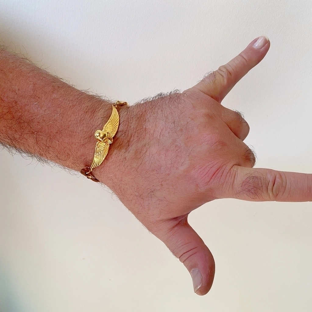 Pulseira semijoia handmade masculina de couro sintético marrom com pingente fixo caveira de asa e fecho italiano banhados a ouro 18k